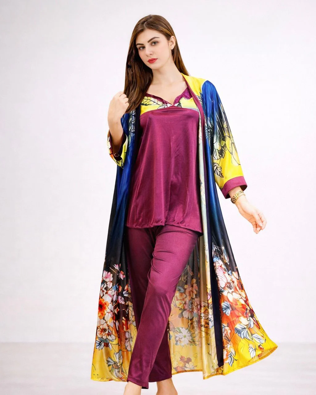 💜 Premium Purple Digital Print 3-Piece Full Sleeve Nighty Set Elegant, Comfortable & Stylish Women’s Sleepwear